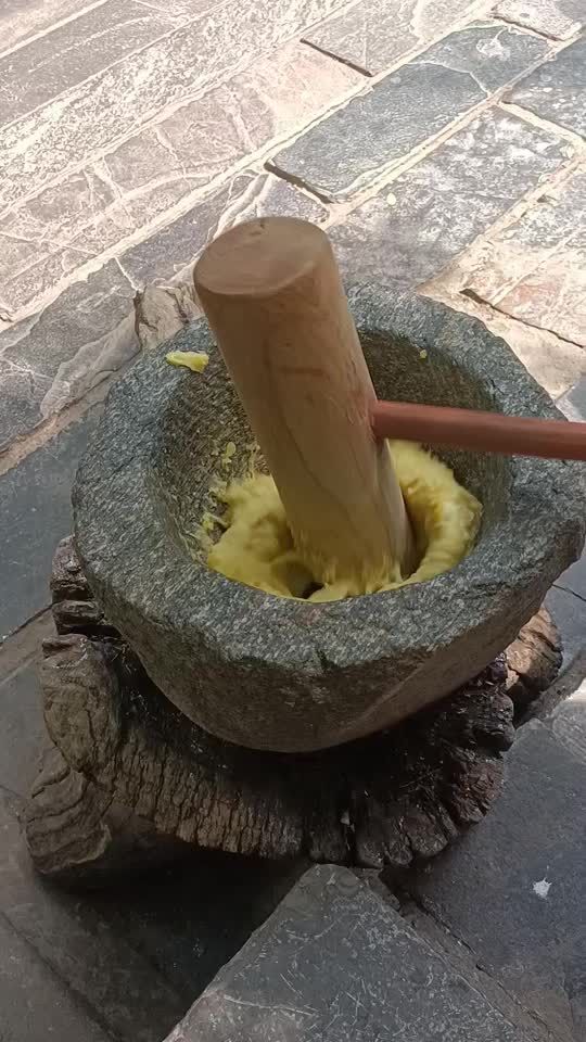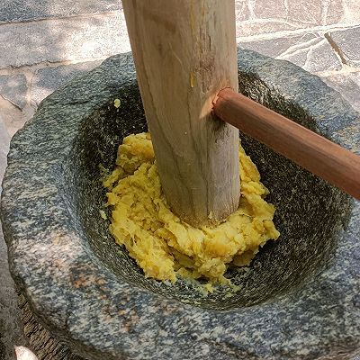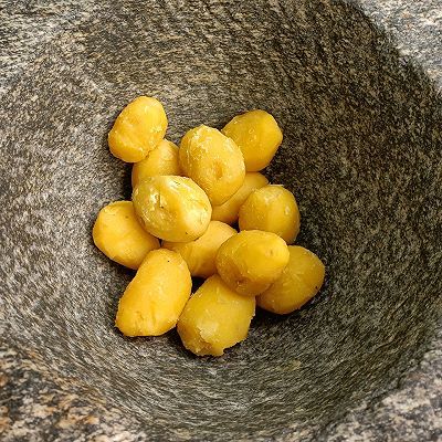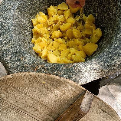 小贴士1、在制作时,选用粗皮个圆的洋芋,洗净放入锅内蒸熟,剥去外皮,然后晾温。2、将晾温后的熟洋芋放入石窝内,现在用木锤来代替石杵砸。 3、把洋芋砸至有很好的粘性和弹性即可。砸的时间越长,食用时就越筋道,口感越好。 4、洋芋糍粑砸好之后,用油炝一锅带有酸菜的浆水汤,在汤内放入适量的花椒粉、蒜泥、葱花、姜末等调料,然后将洋芋糍粑放入温汤内,连菜汤和洋芋糍粑盛入碗中,最后调上香菜和油泼辣子,这样一碗香喷喷的浆水洋芋糍粑又做好了。