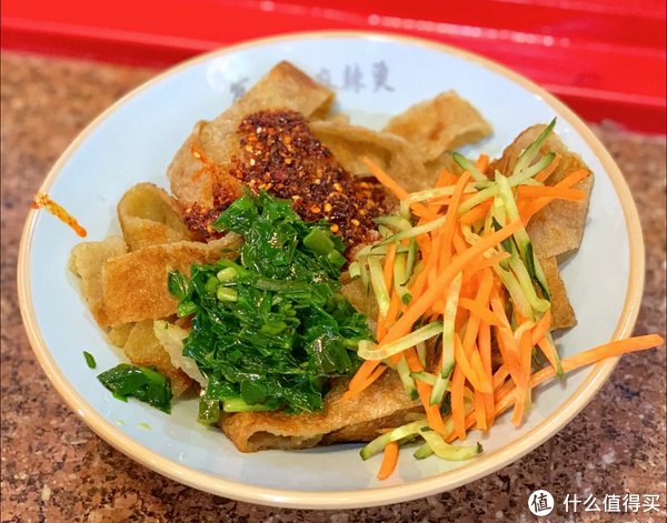 一片片薄薄的土豆片,不再似薯片油炸,只是煮熟后浇上诱人的红油辣椒调味料便可,料中的花椒、辣椒给土豆片增添了惊艳感,吃起来麻辣鲜香,爽脆可口,再搭配上劲软的豆皮一起,两种口感完美互补,好不上瘾。